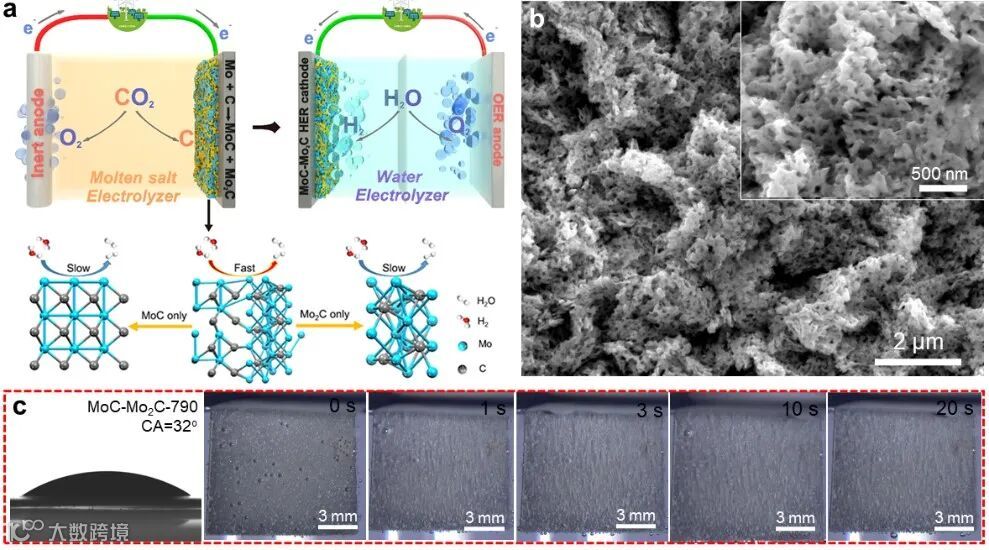 图1. a为自支撑MoC-Mo2C异质结析氢电极的制备、应用和工作原理示意图;b为MoC-Mo2C析氢电极的表面形貌;c为电极的表面润湿性和电解时电极表面细小气体析出照片