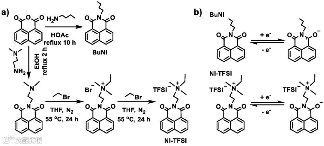 图2. BuNI 和 NI-TFSI 的合成路线和电极反应。