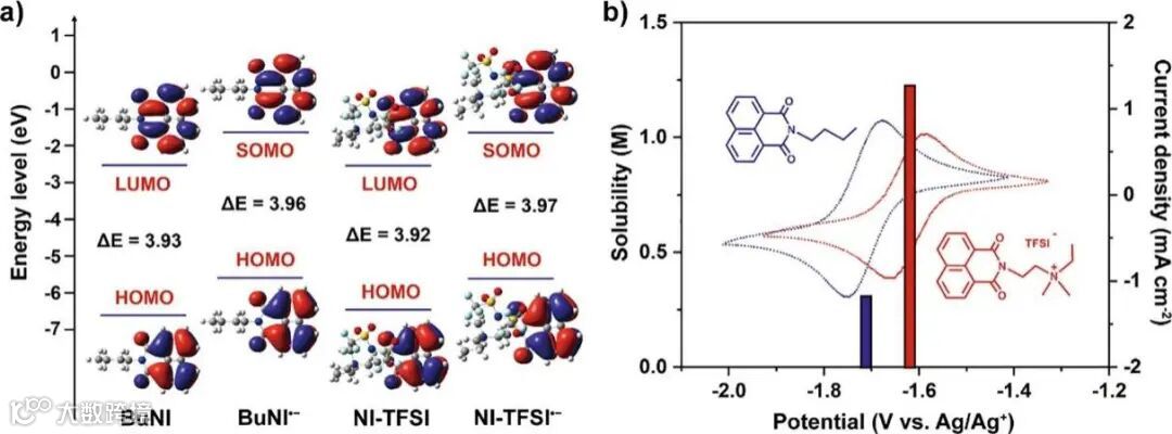 图3.(a)阳极活性物质及其带电自由基物质的分子轨道能级的DFT计算结果。(b)BuNI 和 NI-TFSI 的溶解度和CV 曲线。