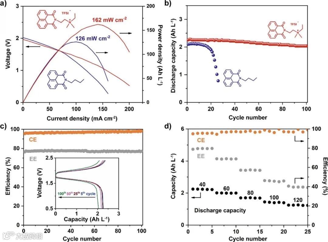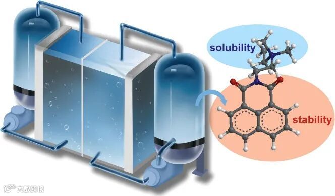 图1. 分子修饰的萘酰亚胺化合物的合成设计以及构成的液流电池示意图。