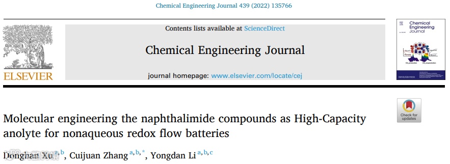 基于此,来自天津大学的李永丹教授和张翠娟副教授课题组在国际知名期刊Chemical Engineering Journal上发表题为“Molecular engineering the naphthalimide compounds as High-Capacity anolyte for nonaqueous redox flow batteries”的研究文章。