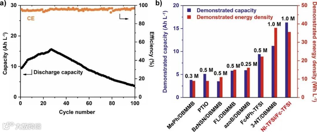 图5. (a)基于1.0 M NI-TFSI/1.0 M Fc-TFSI/1.0 M TEATFSI/MeCN 高浓度液流电池中在 40 mA cm-2 下的的放电容量和 CE。(b) NI-TFSI/Fc-TFSI 体系与报道的高密度非水系液流电池的比较。