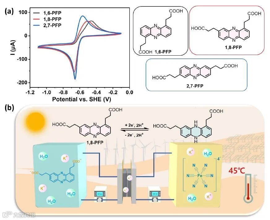 图1. PFPs化合物分子结构,循环伏安测试及高温液流电池概念示意图