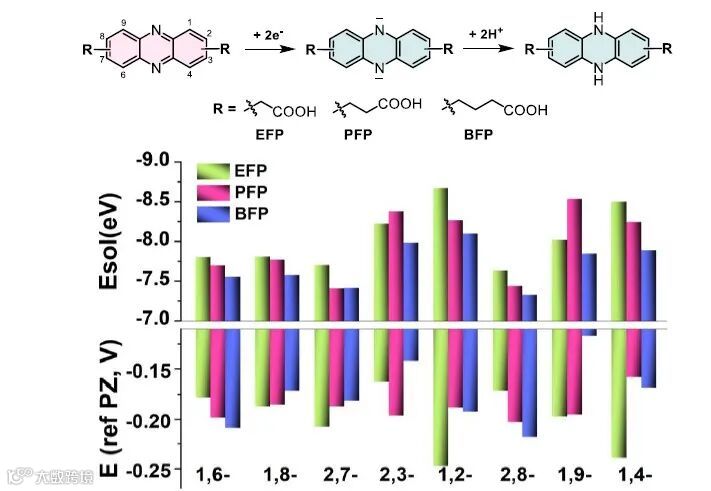 最后,作者结合DFT理论计算探究了不同位点及烷基羧酸取代的吩嗪类衍生物的氧化还原电位以及溶解度性能,计算结果表明,在此类化合物中1,2-EFP及1,4-EFP有着更低的氧化还原电位和更高的溶解度,这些结果也为进一步设计构建高性能水系液流电池提供了重要理论依据。