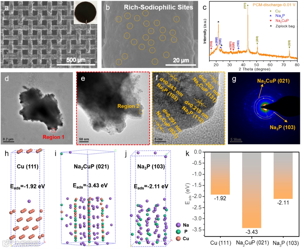 图2. 亲钠性Na-Cu-P复合材料的表征与DFT亲钠性验证。