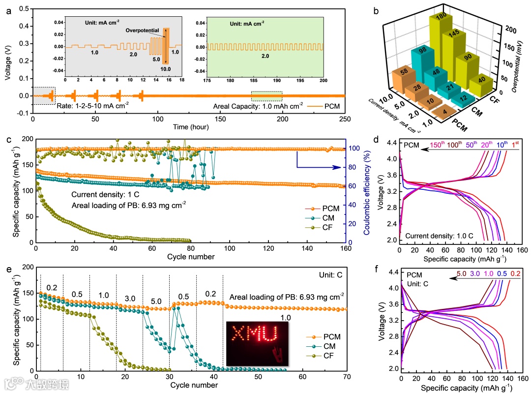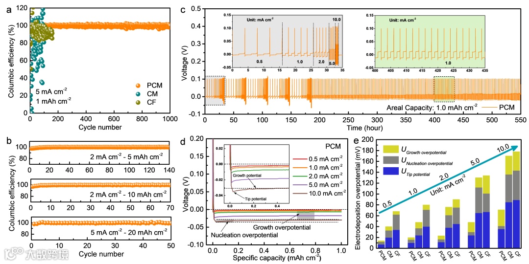 因此,PCM电极可以实现在半电池中高库伦效率的长期循环性能(5 mA cm-2-1 mAh cm-2:>1000次循环;5 mA cm-2-20 mAh cm-2:>50次循环)(图5),并在对称电池中0.5 mA cm-2至10 mA cm-2的电流密度范围内表现出超低的电沉积过电位。