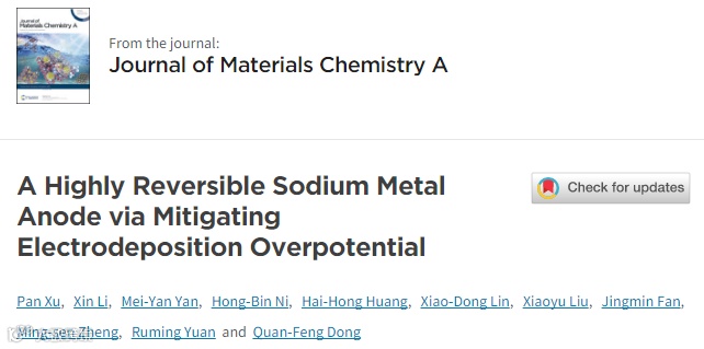 基于此,来自厦门大学化学化工学院董全峰教授团队,在国际知名期刊Journal of Materials Chemistry A(影响因子:12.732)上发表题为“A Highly Reversible Sodium Metal Anode via Mitigating Electrodeposition Overpotential”的观点文章。