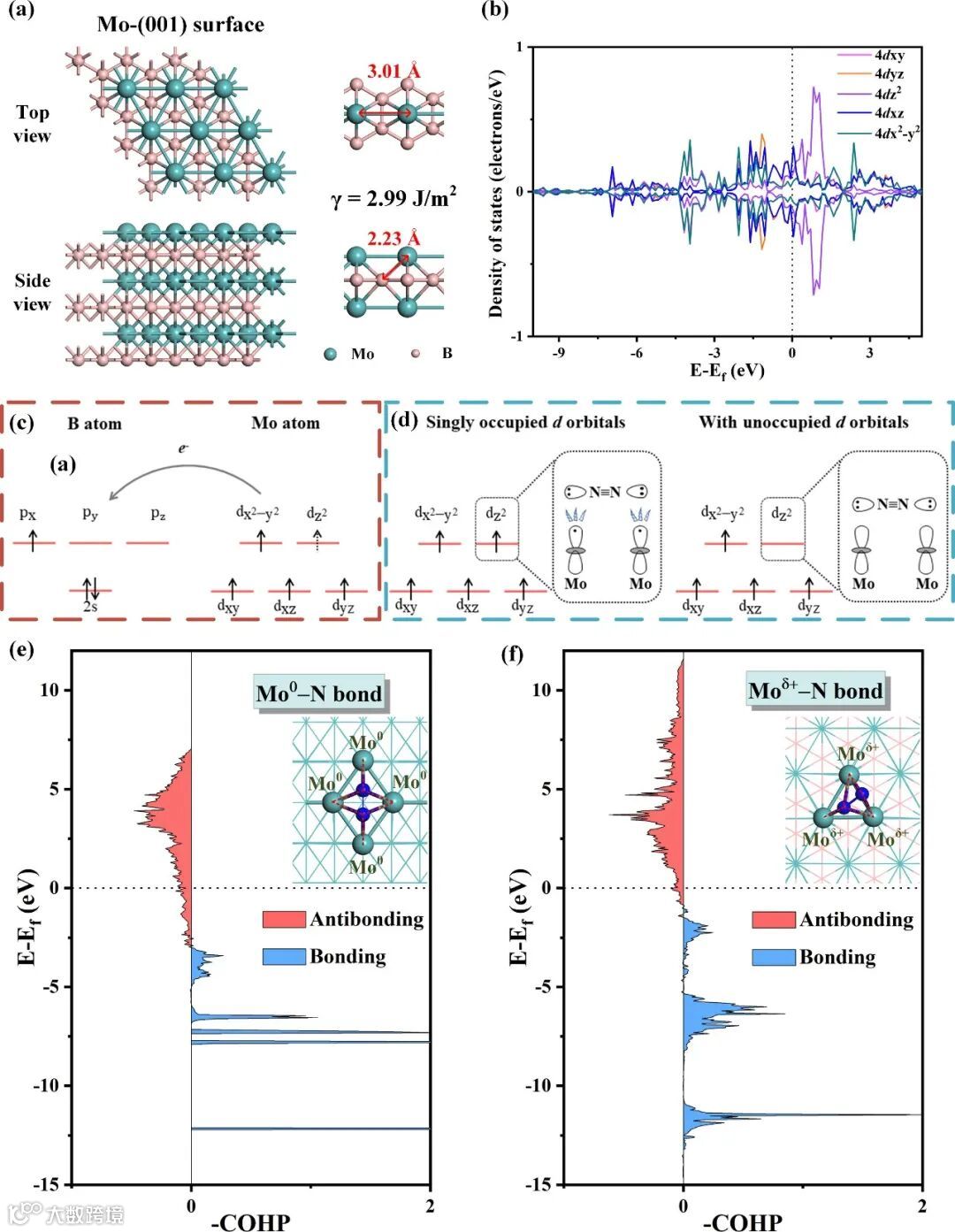 DFT计算表明,Mo终端的(001)表面具有最低的表面能,可以暴露大量的Mo活性位点。同时,Mo与B之间的协同作用使得Mo中部分d轨道电子转移到B原子,从而在表面引入了缺电子的Moδ+位点。值得注意的是,这些Moδ+位点没有过多的电子损失,仍然保持着低价态。