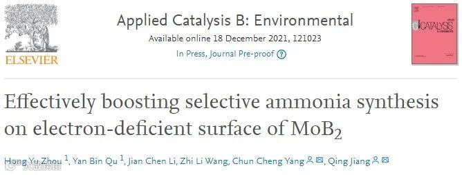 基于此,来自吉林大学的蒋青教授与杨春成教授在国际知名期刊Applied Catalysis B: Environmental上发表题为“Effectively boosting selective ammonia synthesis on electron-deficient surface of MoB2的研究论文。