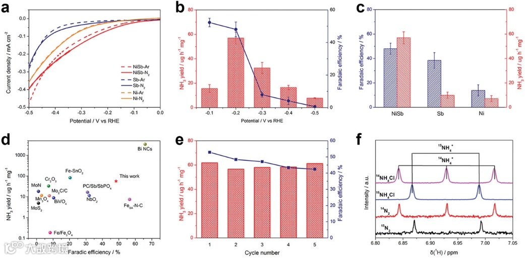 图 3. a) 纳米多孔 Ni、Sb 和 NiSb 在 Ar 和 N2 下的极化曲线。 b) 在不同电位下纳米多孔 NiSb 的 NH3 产率和法拉第效率。 c) 纳米多孔 NiSb、Ni 和 Sb 在 -0.2 V vs RHE 下的法拉第效率和 NH3 产率。 d)各种非贵金属氮还原反应(NRR)电催化剂的性能比较。e) 纳米多孔 NiSb 在 -0.2 V 下的循环测试。f) 分别用 15N2 和 14N2 得到的,纳米多孔 NiSb 电催化后电解质的 1H NMR 光谱。