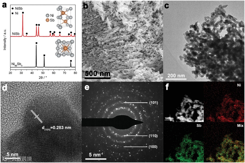 图 2. a) Ni96Sb4 前驱体合金和纳米多孔 NiSb 的 X 射线衍射 (XRD) 图。b) 扫描电子显微镜 (SEM) 图像,c) TEM 图像,d) 高分辨率 TEM 图像,e) 选区电子衍射图,以及 f) 纳米多孔 NiSb 的元素mapping图。