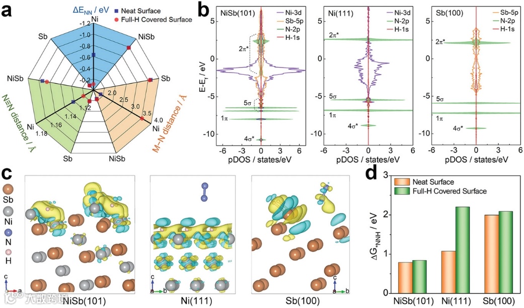 图 6. a) N2 的结合能、活性位点与 N 原子之间的距离 (M-N) 以及N≡N在 NiSb(101)、Ni(111) 和 Sb(100) 上的键长(在有和没有完全 H 覆盖条件下)。N2 在全 H 覆盖的 NiSb(101)、Ni(111) 和 Sb(100) 表面上吸附的 b) PDOS 和 c) 电荷密度差异。黄色和青色等值面分别代表真实空间中的电荷积累和消耗。d)NiSb(101),Ni(111)和Sb(100)的决定步骤的自由能变化(在有和没有完全 H 覆盖条件下)。
