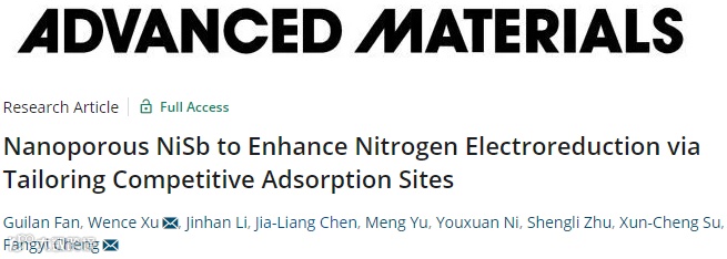 常温常压氮还原反应(NRR)引起了科学界广泛的兴趣,但由于竞争性快速析氢反应的存在以及氮活化过程较难,该反应仍然受到动力学缓慢的严重影响。在此,纳米多孔 NiSb 合金被报道为一种有效的 NRR 电催化剂,实现了 56.9 µg h-1 mg-1 的高氨产率和 48.0% 的法拉第效率。密度泛函理论计算表明,在 NiSb 合金中,Ni 有利于 N2 氢化,而相邻的 Sb 将质子和 N2 吸附的活性位点分开,这优化了中间体的吸附/解吸,并实现了能量有利的 NRR 途径。这项工作表明了 3d 和 p 族金属合金对 NRR 的电催化应用具有广阔前景,并提供了一种新颖的策略:通过抑制竞争性氢吸附来增强惰性分子的还原。
