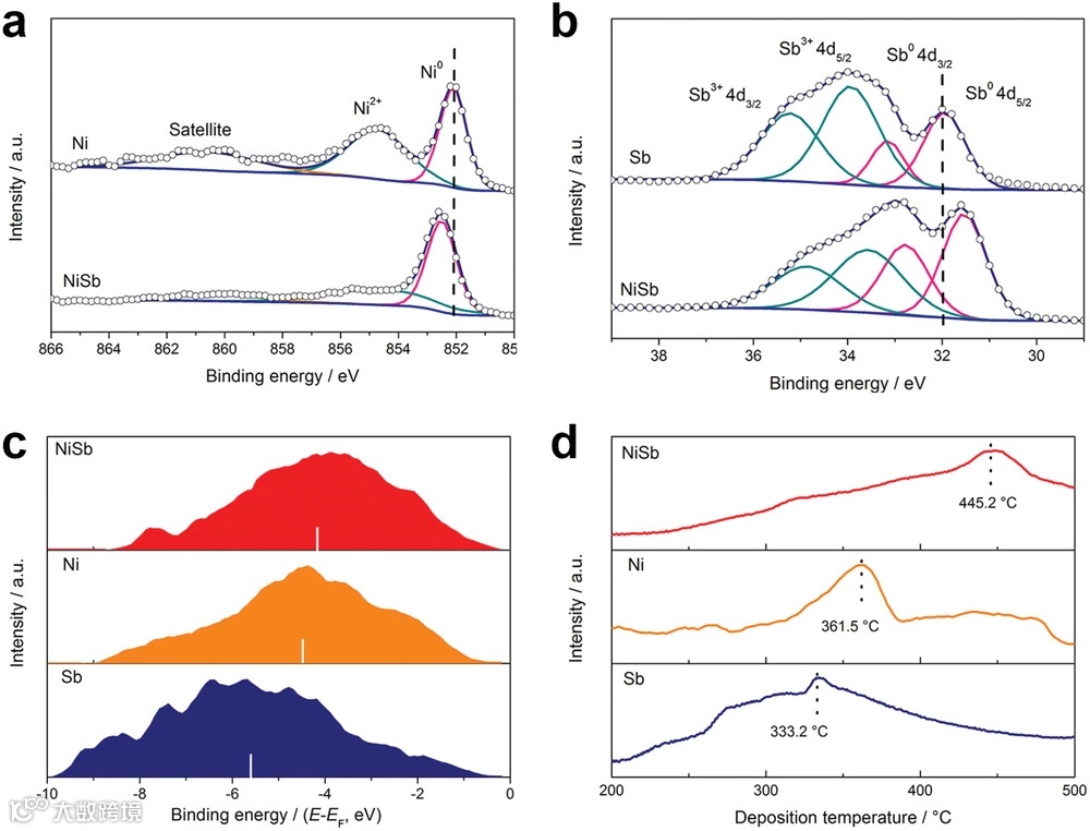 图 4. a) Ni 和 NiSb 的 Ni 2p 以及 b) Sb 和 NiSb 的 Sb 4d 的 X 射线光电子能谱 (XPS) 光谱。c) NiSb、Ni 和 Sb 的表面价带光电发射光谱。d) NiSb、Ni 和 Sb 的 N2 程序升温解吸曲线。