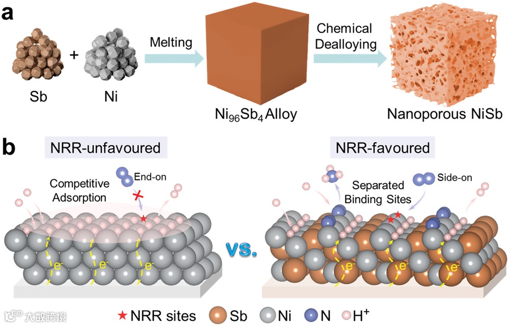 图 1. a) 纳米多孔 NiSb 的合成过程示意图。b) Ni 和 NiSb 上的氮还原反应 (NRR) 的示意图比较。