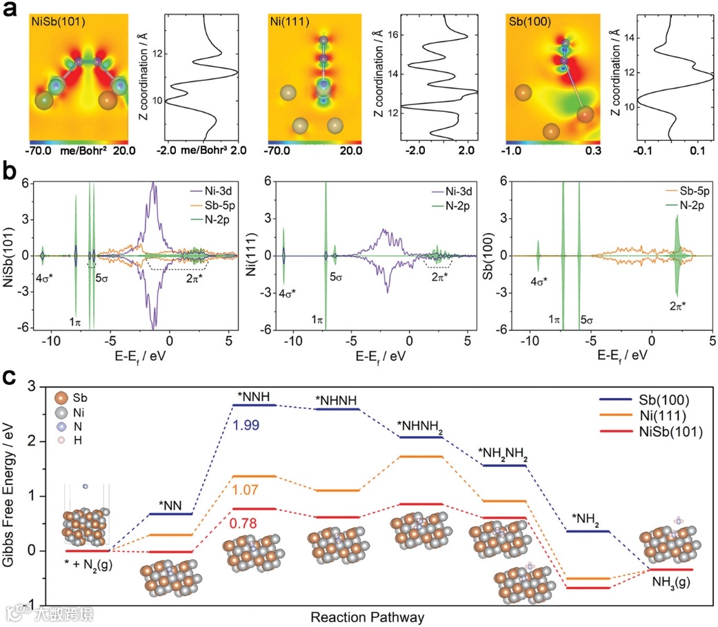 图 5. a) 吸附在 NiSb (101)、Ni (111) 和 Sb (100) 上的 N2 的二维电荷密度和平面平均电荷密度。红色和蓝色轮廓分别表示富集和耗尽的电荷密度。 b) N2 吸附在 NiSb(101)、Ni(111) 和 Sb(100) 上的 PDOS。c)NiSb(101)、Ni(111)和Sb(100)上氮还原反应(NRR)的吉布斯自由能分布,以及NiSb催化NRR过程中含氮物质的优化结构。