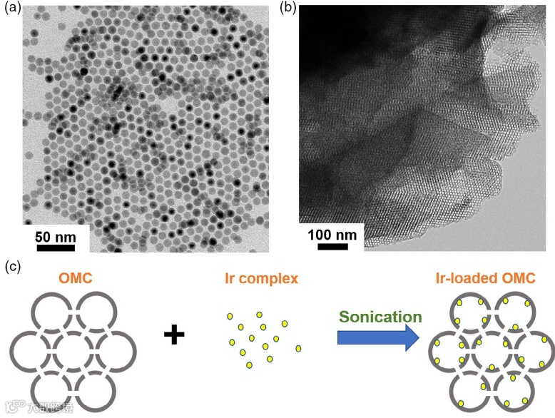 有序介孔碳结构通过模板法得以合成,其中单分散的四氧化三铁纳米粒子自组装的超晶格结构作为刻蚀的模板(如图2所示)。铱分子催化剂通过超声吸附的方式被固定在具备有序孔道结构的碳材料表面。