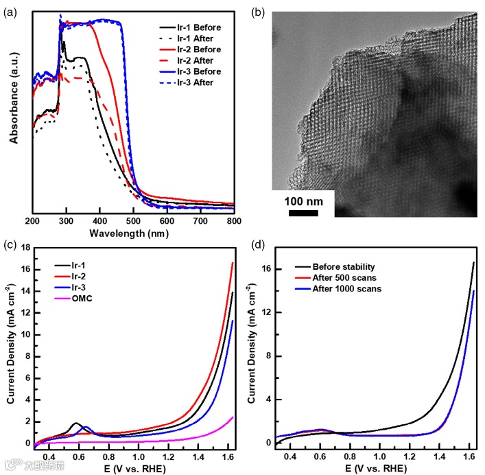 该工作通过引入芘基到取代羟甲基吡啶配体 (pyalk) 以及联吡啶配体合成出具有不同分子结构的铱分子催化剂。由于配体的改性设计,铱分子催化剂与有序介孔碳存在π-π堆积作用。铱分子催化剂的配位结构通过X光单晶衍射得以准确分析。