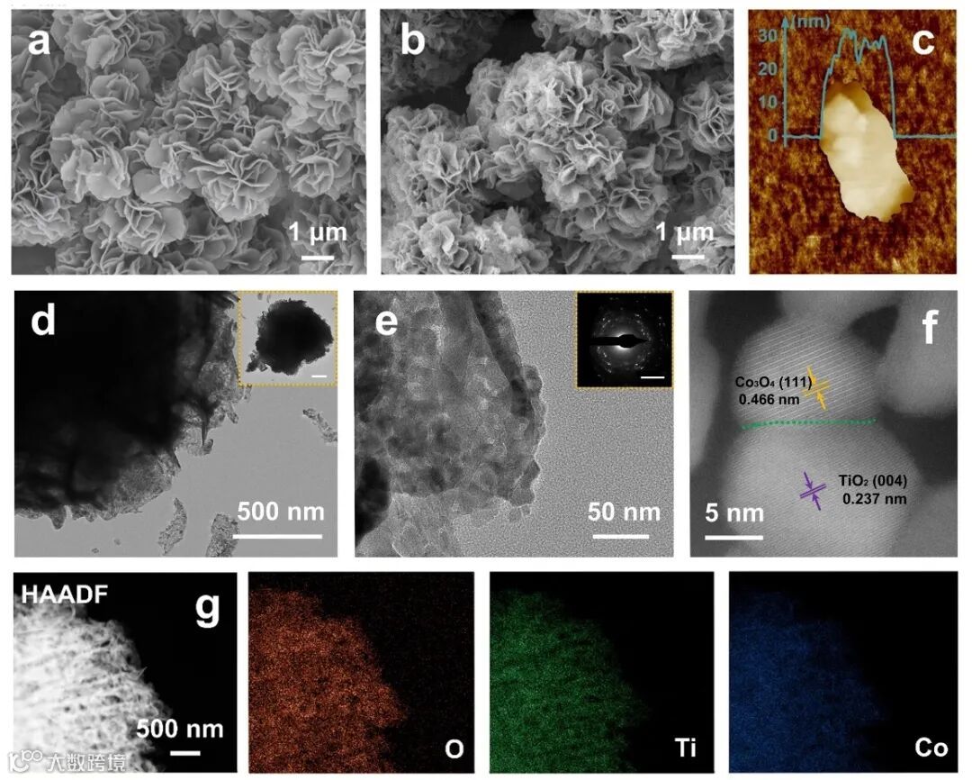 图4. (a)Co/Ti-LDHs-HPs和(b)p-Co3O4/n-TiO2-HPs的FESEM图。(c)p-Co3O4/n-TiO2-HPs薄片单元的AFM图。(d-f) p-Co3O4/n-TiO2-HPs的TEM图。(g)p-Co3O4/n-TiO2-HPs的元素分布图。