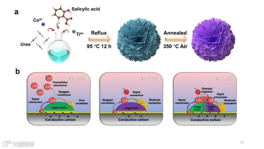 图1. (a)p-Co3O4/n-TiO2 异质载体的合成路线以及(b)空间次序催化多硫化锂转化机制的示意图。