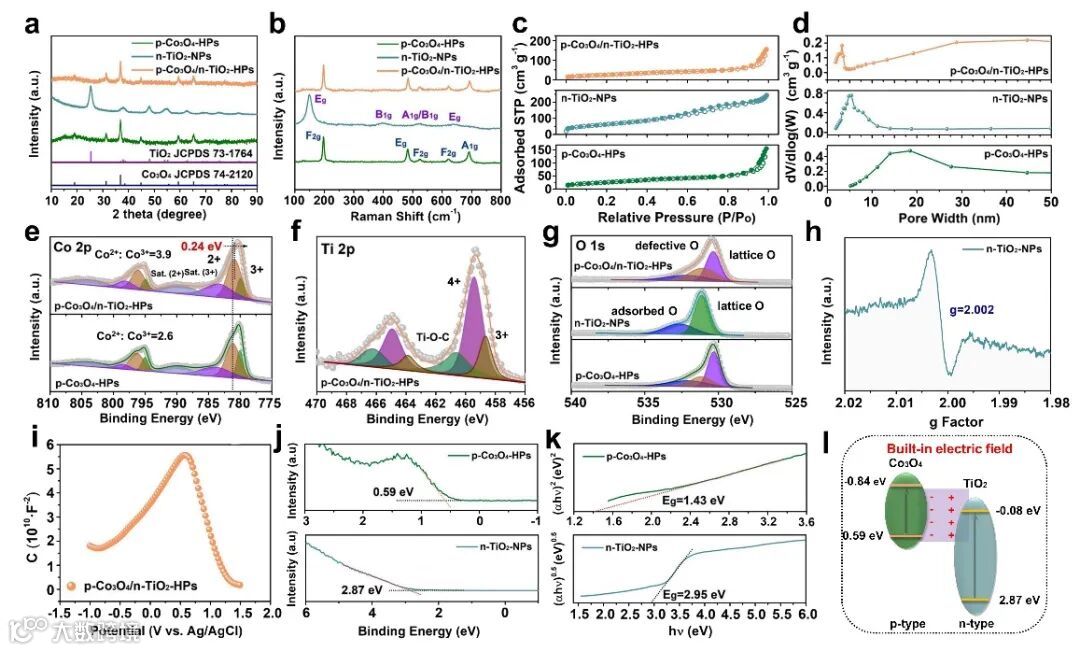 图5. 载体材料的(a)XRD谱图,(b)Raman谱图,(c)N2吸脱附等温线,(d)孔径分布图,(e-g)XPS谱图,(h)EPR谱图,(i)Mott-Schottky图,(j) UPS价带谱图,(k)Tauc带隙图以及(l)p型Co3O4和n型TiO2耦合的能带示意图。