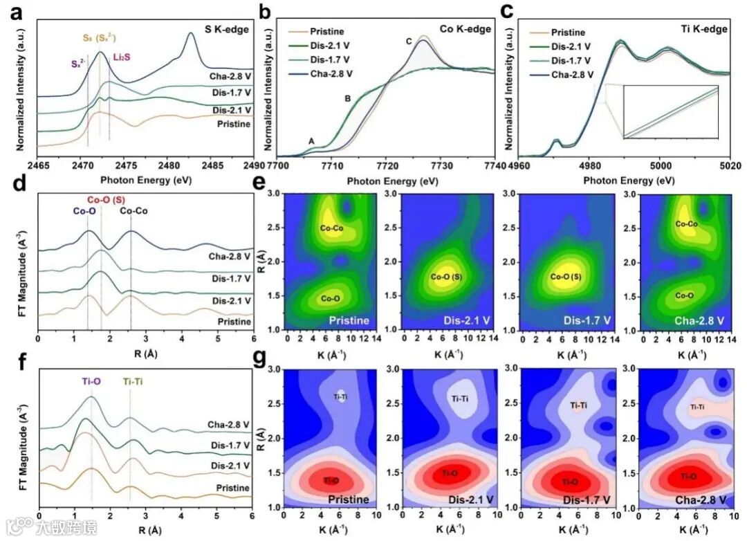 图3. 不同电位下(a)S K-edge, (b)Co K-edge 和(c)Ti K-edge的XANES谱图。(d,e)不同电位下Co K-edge的FT-EXAFS谱图以及对应K边WT变换等高线图。(f,g)不同电位下Ti K-edge的FT-EXAFS谱图以及对应K边WT变换等高线图。