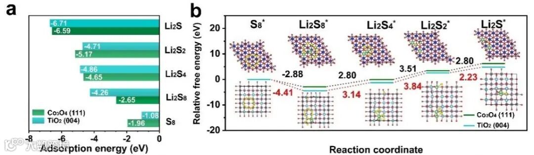 此外,过强的多硫化锂吸能特性往往使得多硫化锂较难脱附,因而赋予组分特定的对多硫化锂的化学结合能也是有必要的。因此,在本工作中,Co3O4对多硫化锂温和的化学吸附能力使得在后续Li2S4迁移到具有更强吸附能力的TiO2表面更为容易。