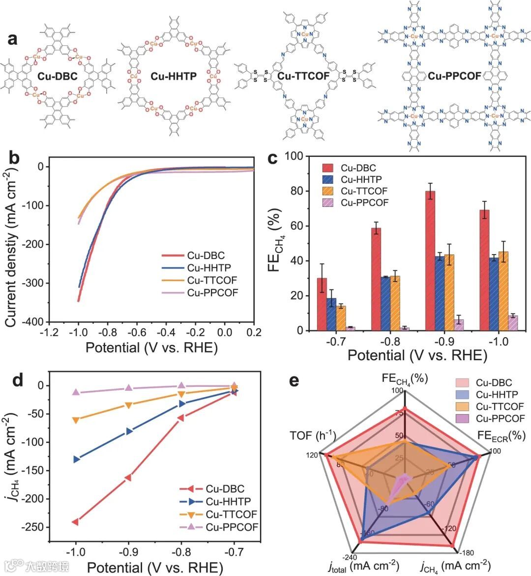 电化学CO2还原(ECR)制备高附加值化学品是能源转化领域最具前景和挑战性的研究之一。在本文中,作者设计出一种基于铜基导电金属-有机骨架(Cu-DBC)的高效ECR催化剂,可成功地将CO2还原为CH4,生成CH4的法拉第效率高达~80%,在−0.9 V vs.RHE时的电流密度高达−203 mA cm−2。基于理论计算和实验测试结果的进一步研究表明,在ECR过程中,由于Cu-O4位点的能垒较低,因此具有氧配位Cu位点的Cu-DBC催化剂比其它两种具有氮配位Cu位点的晶体催化剂具有更高的ECR选择性和活性。该工作揭示了晶体多孔催化剂中ECR选择性对Cu位点配位环境的强烈依赖性,并为构建高选择性的ECR催化剂提供了平台。