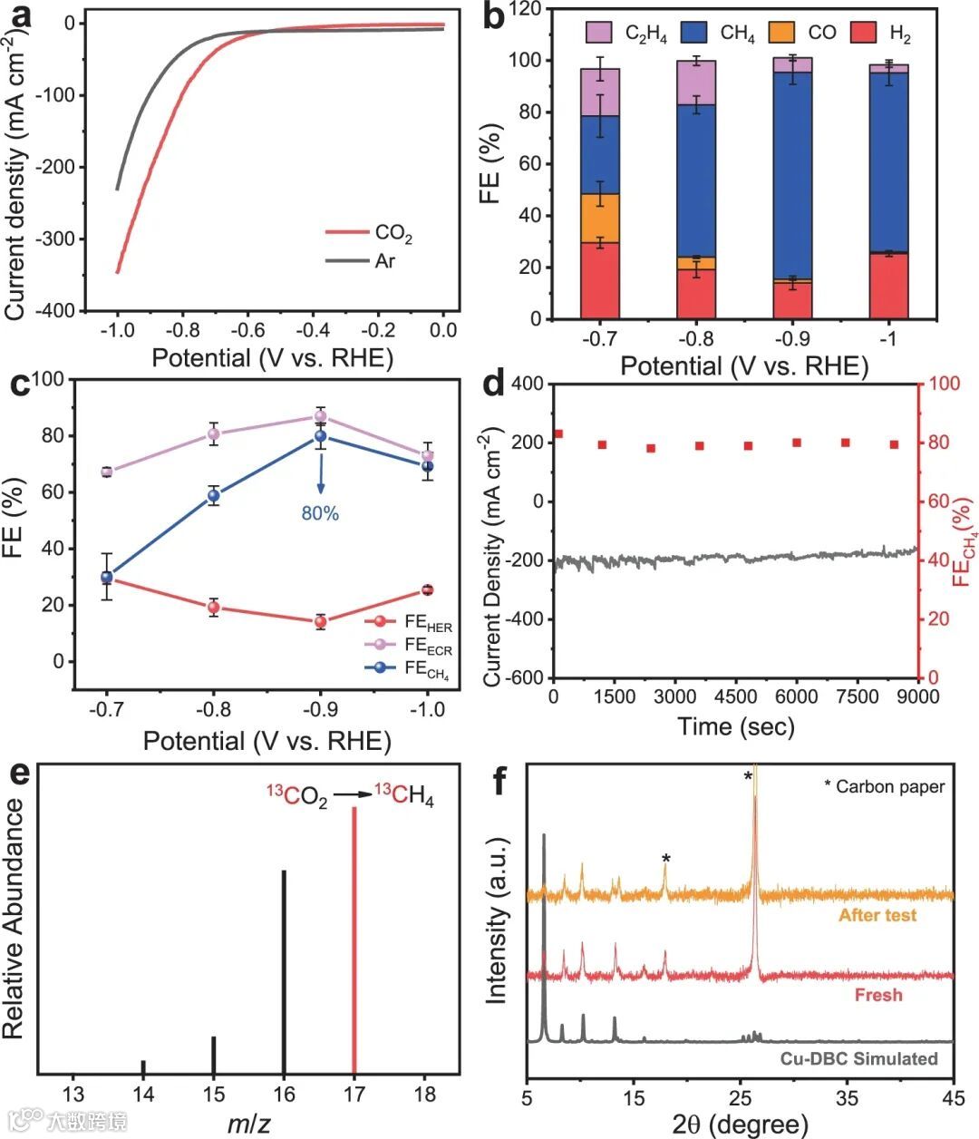 图2.Cu-DBC电催化剂ECR-to-CH4性能:(a)在CO2和Ar中的极化曲线;(b)不同施加电位下ECR产物的法拉第效率(FEs);(c)不同施加电位下HER, ECR, CH4的FEs;(d)在−0.9 V恒定电压下CH4的电流曲线和FEs;(e)在13CO2气氛下记录的13CH4质谱;(f)用GDL碳纸修饰Cu-DBC后,新制备和测试后的XRD衍射结果。