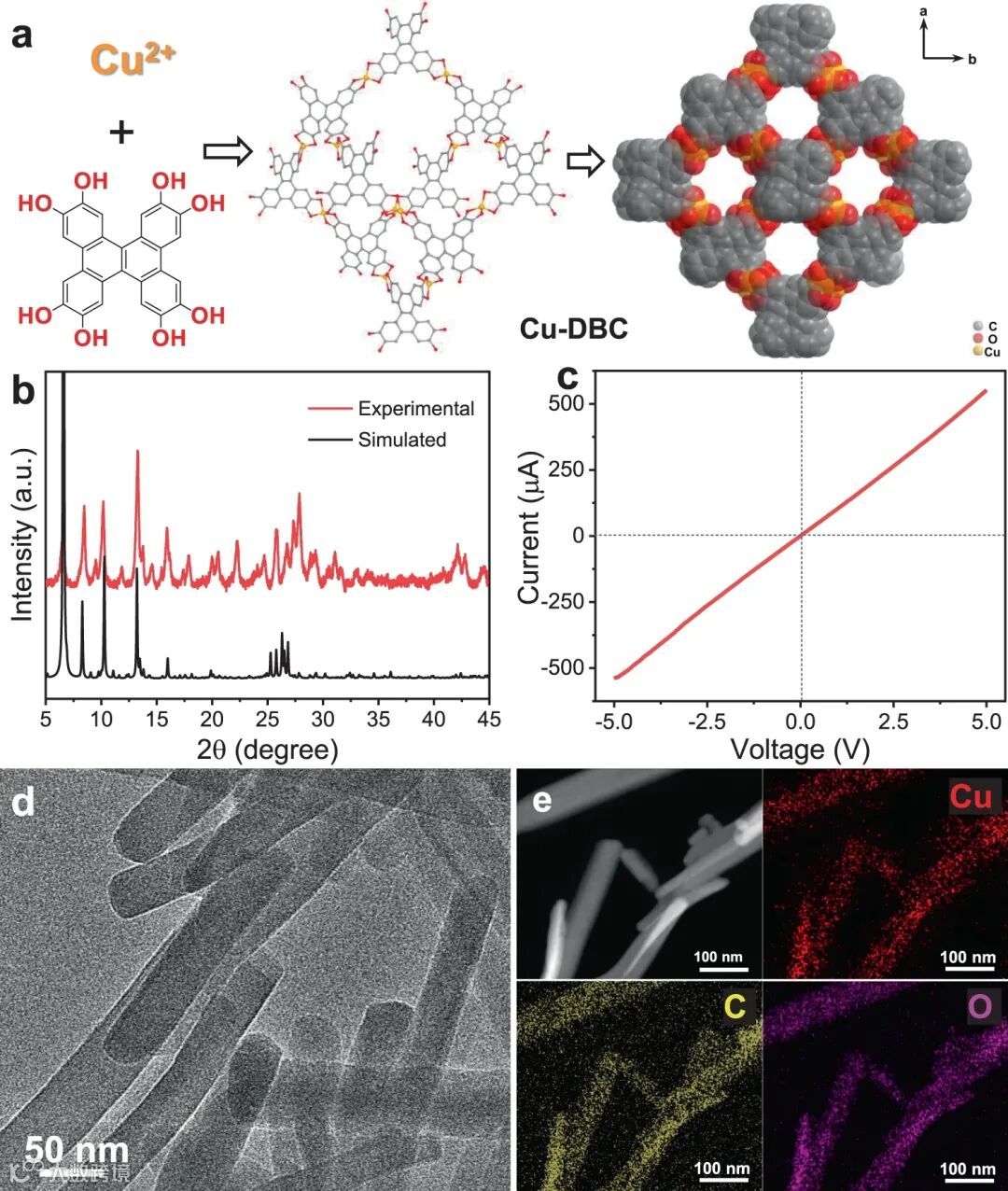 图1.Cu-DBC电催化剂的表征:(a)由Cu离子和8OH-DBC反应形成Cu-DBC的结构;(b)实验和模拟的PXRD衍射结果;(c)四探针法测试出的电流-电压特性;(d) TEM图;(e) STEM图及其对应的Cu, C, O元素映射图。