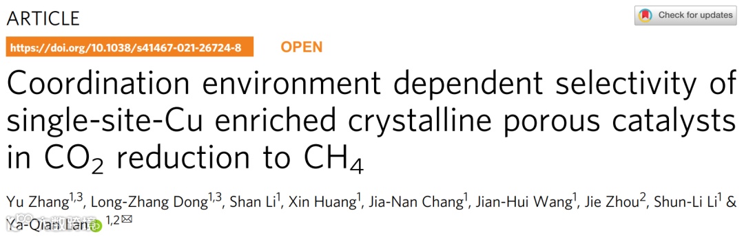 Yu Zhang, Long-Zhang Dong, Shan Li, Xin Huang, Jia-Nan Chang, Jian-Hui Wang, Jie Zhou, Shun-Li Li, Ya-Qian Lan. Coordination environment dependent selectivity of single-site-Cu enriched crystalline porous catalysts in CO2 reduction to CH4. Nature Communications. 2021. DOI: 10.1038/s41467-021-26724-8.