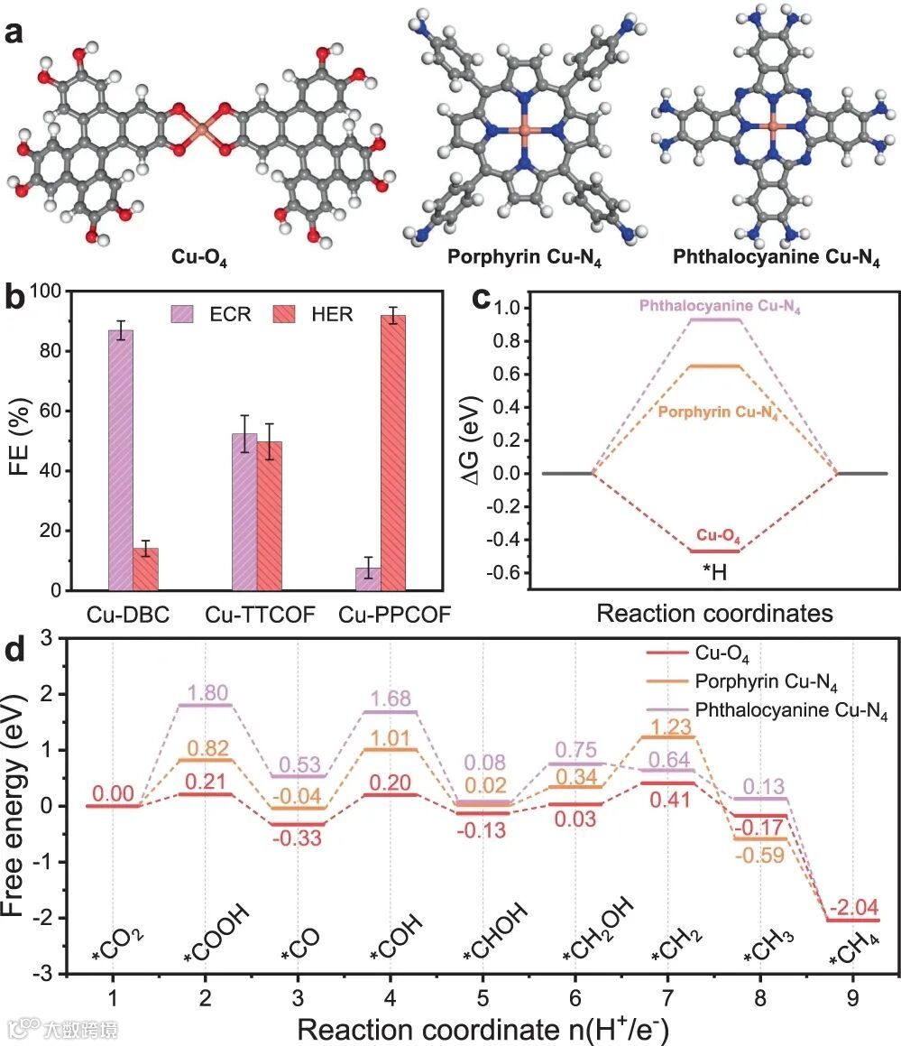 图4.ECR选择性对Cu位点配位环境的依赖性:(a)在Cu-DBC, Cu-TTCOF, Cu-PPCOF催化剂中Cu–O4,卟啉Cu–N4和酞菁Cu–N4位点的DFT计算模型,其中灰色、蓝色、红色、白色和橙色球体分别代表C、N、O、H和Cu原子;(b)在不同的单位点Cu催化剂上,电位为−0.9 V时ECR和HER的FEs;(c) DFT计算得出*H吸附在不同催化位点上的能量;(d) ECR-to-CH4反应途径的自由能。