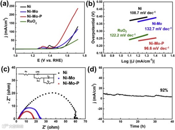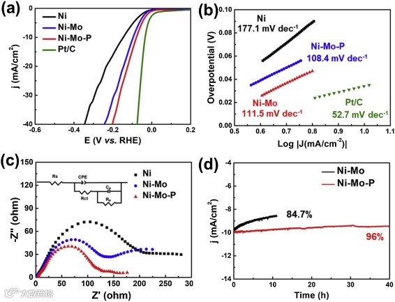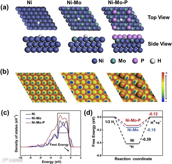 原位掺杂的P降低Ni-Mo位点周围的电子云密度,产生了大量空d轨道,促进了H*和OH-的吸附效果;