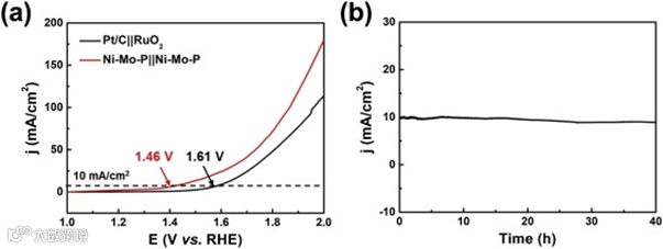 气凝胶结构的高比表面积、高孔隙率为材料提供了更多暴露的活性位点与传质途径,进一步提升了材料的催化效果。此外,Ni-Mo-P材料还具有良好的稳定性,经过40 h稳定性测试后,析氢、析氧和全解水均能维持90%以上的催化活性
