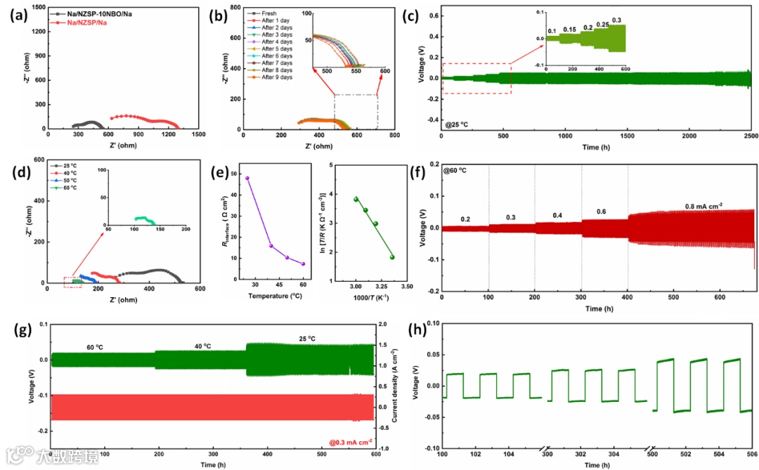 最优添加量下,Na3Zr2Si2PO12-10% Na2B4O7(NZSP-10NBO)的室温离子电导率为1.7 mS cm-1,是Na3Zr2Si2PO12的2.5倍。同时,Na//Na对称电池测试表明,Na3Zr2Si2PO12-10% Na2B4O7与Na金属间兼容性显著增强,界面离子电导激活能为0.49 eV,室温界面电阻仅为36 Ω cm2,静置9天界面电阻没有明显增加。室温充放电曲线表明,在0.3 mA cm-2电流密度下,Na/NZSP-10NBO/Na对称电池可保持2500 h稳定循环,Na金属镀/剥过电位保持平稳,仅为50 mV。