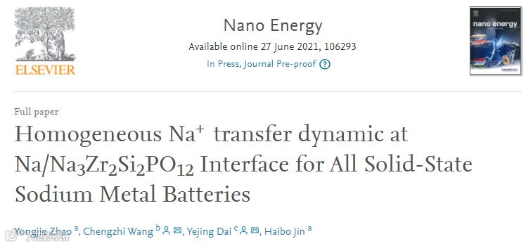 基于此,北京理工大学金海波教授课题组Nano Energy发表题为“Homogeneous Na+ transfer dynamic at Na/Na3Zr2Si2PO12 Interface for All Solid-State Sodium Metal Batteries”的文章,论文通讯作者是王成志助理研究员和戴叶婧副教授,第一作者是赵永杰副教授。