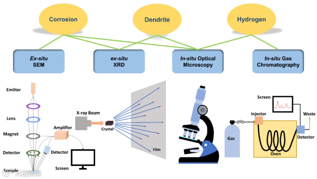 根据以往的报道,常用的表征技术有光学显微镜、X射线(XRD)、扫描电镜(SEM)、气相色谱(GC)、等,这些表征手段可以用于检测不同问题,例如光学显微镜可以原位观测枝晶生长情况,同时它也可以用于检测氢气的析出。不同表征手段可以用于检测不同的锌电极问题,如图5所示。