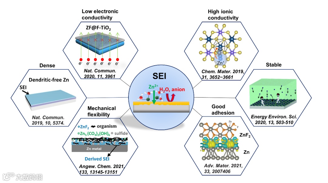 人工SEI层作为一种典型的物理防护方法,在最近的文献中得到了广泛的报道。虽然物理SEI保护层的构建在一定程度上提高了锌的库伦效率和循环稳定性,但目前优良SEI保护层的标准仍缺乏普遍共识。本文中,作者将理想的SEI标准总结如下:
