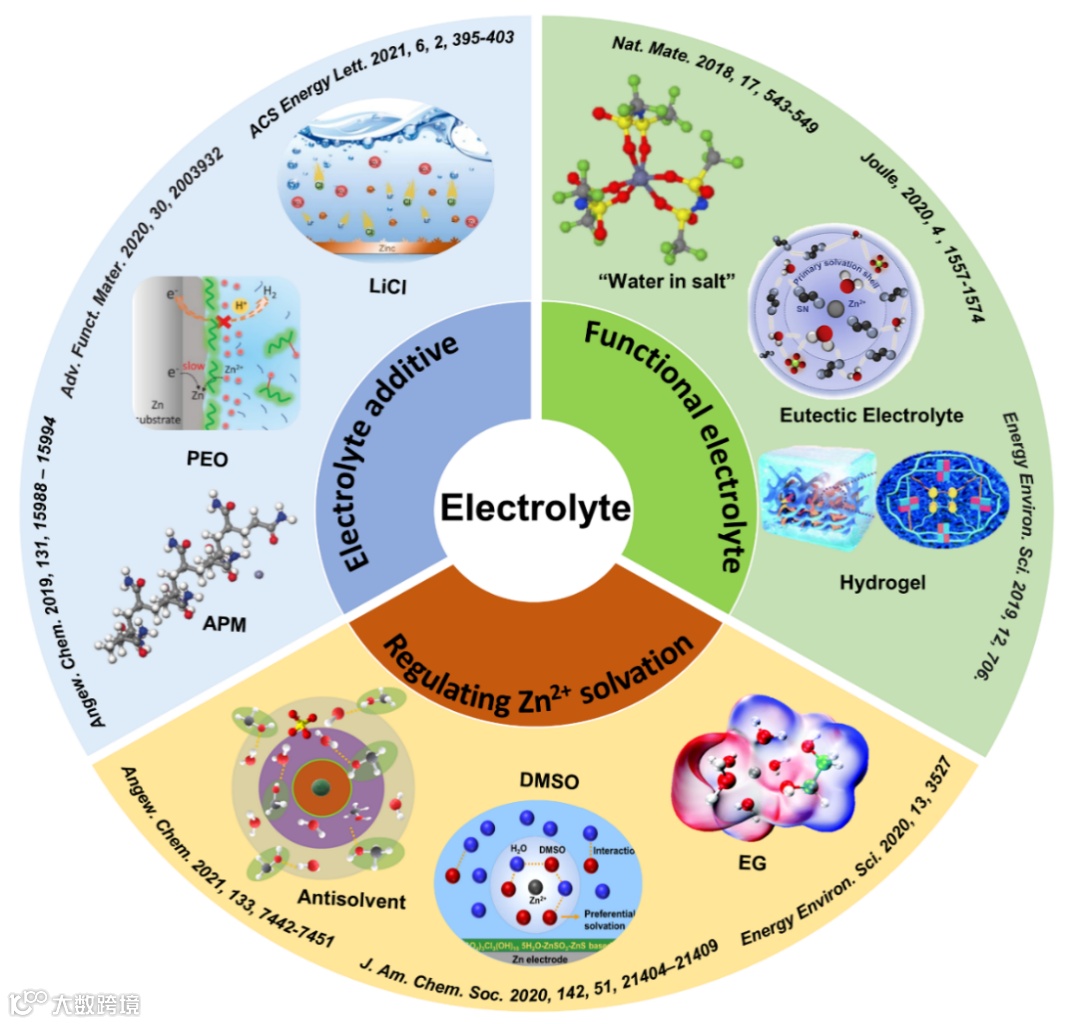 作为界面相的另一重要组成部分,该电解质还可以通过抑制树枝状锌沉积和延缓副反应来增强锌电极的库伦效率, 主要的策略可以分为一下三种:a) 加入电解液添加剂 (无机以及有机添加剂),b) 开发功能性电解液(减少电解液中自由水的含量)c) 调整锌离子的溶剂化结构(反向溶剂策略,DMSO, 乙二醇,葡萄糖等改变溶液氢键),如图3所示。