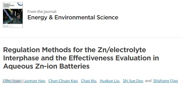 【顶刊综述】乔世璋教授EES:水系锌离子电池锌/电解液界面的调节及性能评估