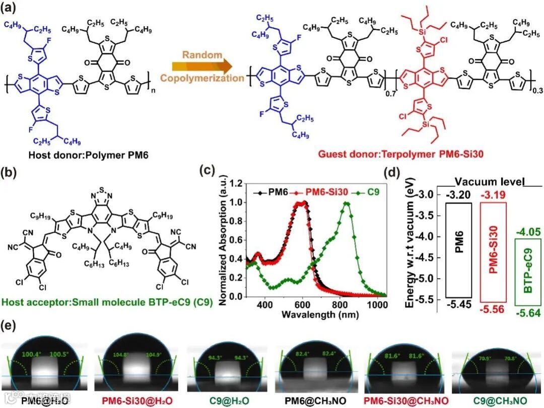 该三元共聚物表现出更深的最高占据分子轨道,与PM6和BTP-eC9均有良好的混溶性,使其能够用作OSC的 PM6:PM6-Si30:BTP-eC9 本体异质结的第三组分。
