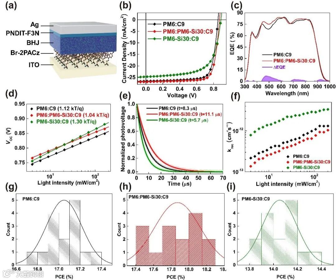 此外,PM6-Si30的最高占据分子轨道(HOMO)能级略低于PM6,与基于PM6的二元OSC相比,三元OSC的非辐射能量损失更低,从而导致更高的开路电压(VOC)。由于这些协同效应,所得PM6:PM6-Si30:BTP-eC9(0.85:0.15:1.2)电池的最大光电转换效率 (PCE) 为18.27%,高于优化控制二组分PM6:C9的OSC (17.38%)。PM6:PM6-Si30:BTP-eC9 电池的性能增强归因于改进的电荷传输、有利的分子排列、减少的能量损失和抑制双分子重组。