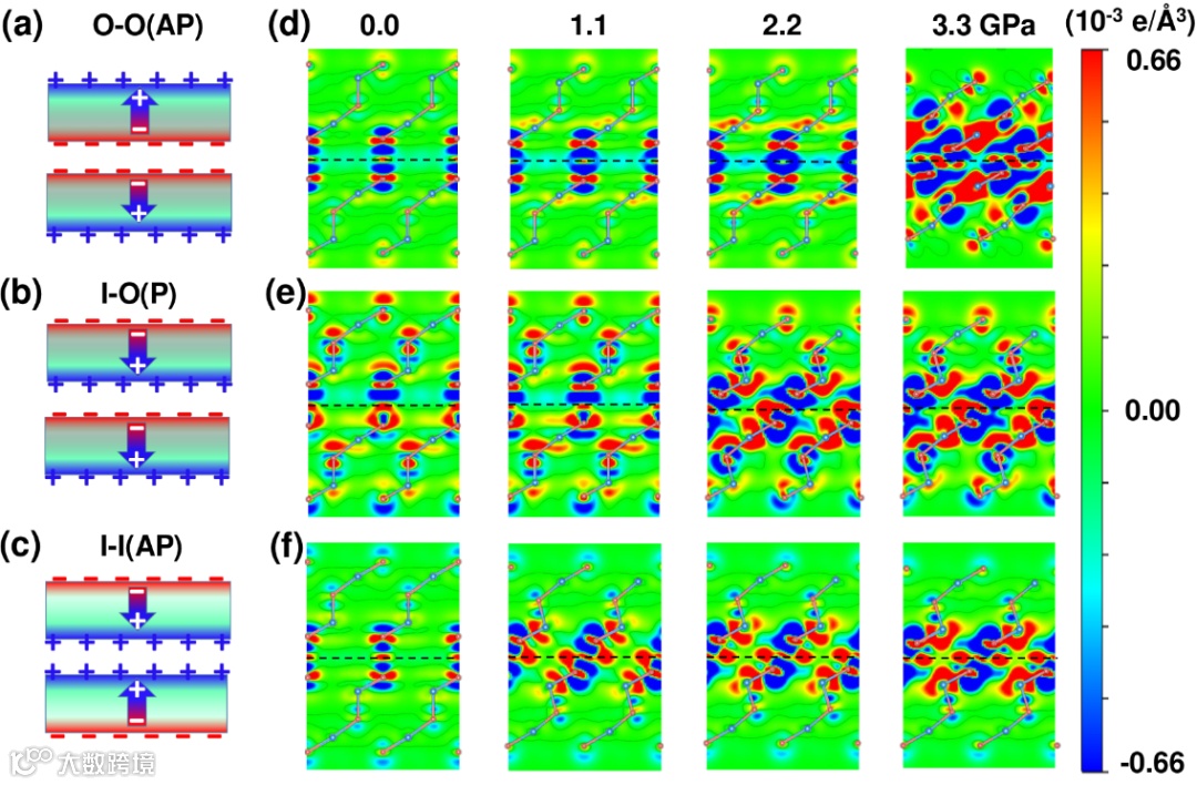 图4 :(a)-(c)三种稳定2QL-In2Se3同质结极化电荷相互作用示意图。(d)-(f)外压力下,(110) 切面上的差分电荷密度分布图。