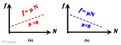 在宏观尺度上,根据达芬奇-阿蒙顿的经典定律,摩擦力(f)随着法向载荷(N)的增加而增大,即遵循f = µN,其中摩擦系数µ为正值(µ>0),如上图1(a)。然而,在微观尺度,摩擦易受温度、载荷、接触面积、滑动速度、层数、表面形貌等多方面因素的影响,使得微观摩擦变得及其复杂。