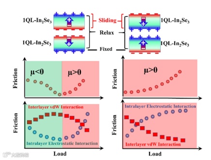 研究揭示其反常摩擦行为的物理根源在于层间范德华(vdW)相互作用引起的滑动能垒的增加部分可以被层内静电能的显著减少来进行有效补偿,如图2所示,这也是载荷状态下极化电荷重新转移的过程。研究进一步指出滑动微分摩擦系数µ可通过面外或面内的偶极-偶极排列方向及施加适当的外电场来进行调控,从而实现µ<0,µ≈0和µ>0的转变。