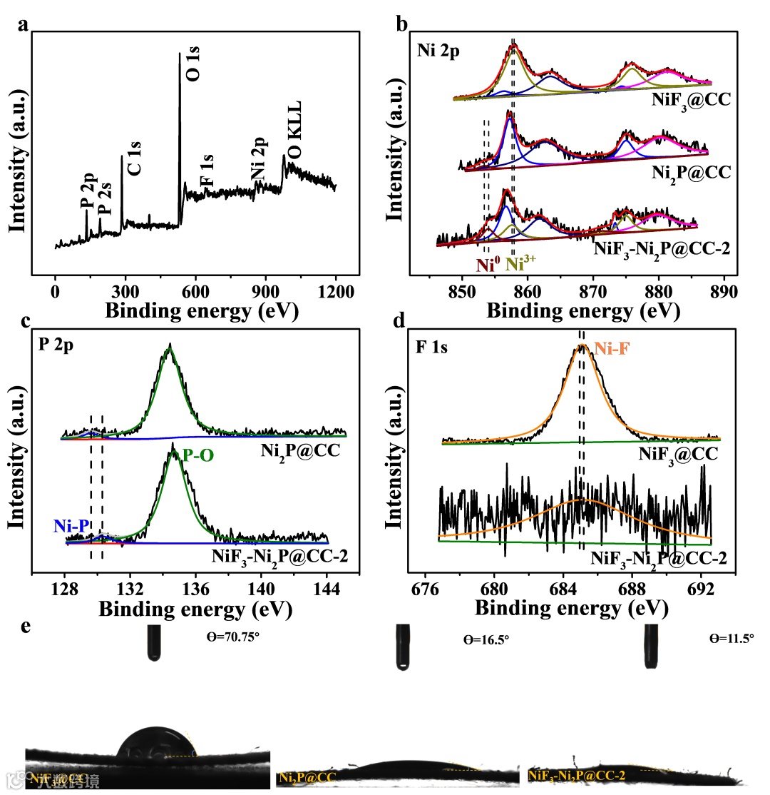 图3:NiF3/Ni2P@CC-2催化剂电子结构图谱和亲水性测试