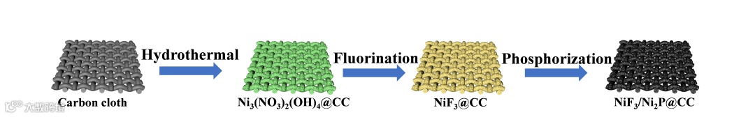 最后,通过对NiF3@CC进行磷化处理,得到NiF3/Ni2P@CC异质结构,产物颜色变黑。