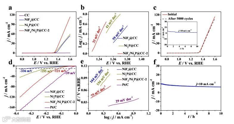 具体地,NiF3/Ni2P@CC-2催化剂仅需1.36 V 的电位来驱动10 mA cm-2的电流密度,且在5000次CV循环后表现出较好的催化稳定性。对于HER,该催化剂仅需121 mV 的过电位即可驱动10 mA cm-2的电流密度。