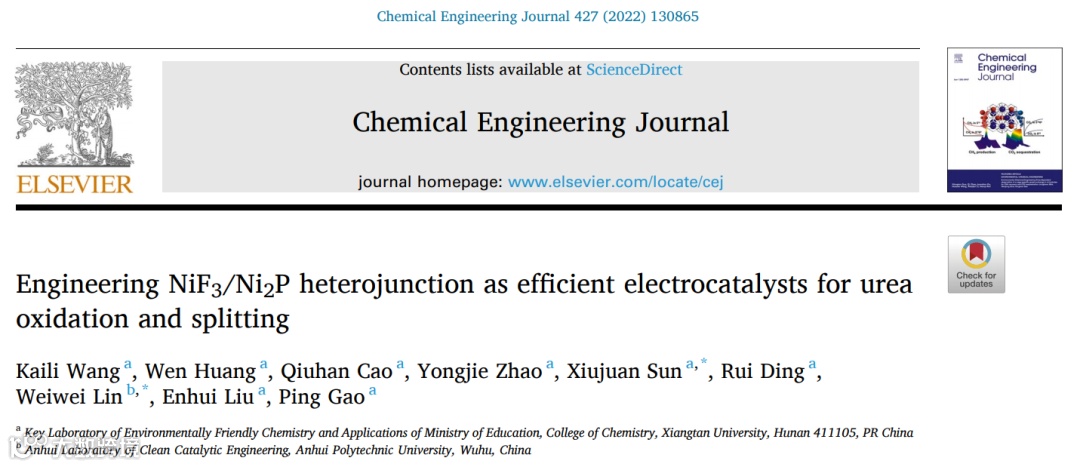孙秀娟博士、林伟伟博士CEJ文章:NiF3/Ni2P异质结材料促进尿素全分解