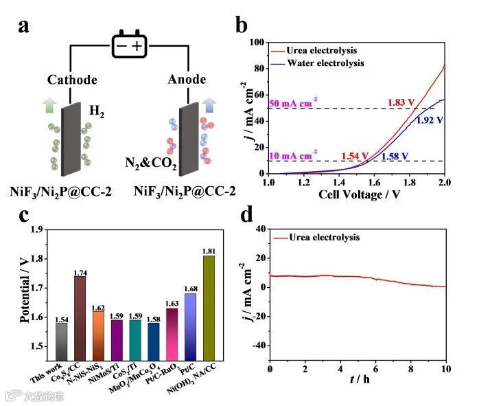 受到对UOR和HER良好催化性能的启发,我们构建了以NiF3/Ni2P@CC-2催化剂为正极和负极组建的整体尿素电解体系。在1.0 M KOH+0.33 M尿素电解液中,NiF3/Ni2P@CC-2只需低压1.54 V就能产生10 mA cm−2电流密度,催化性能明显优于整体水电解的性能。